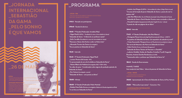 A "Jornada Internacional Sebastião da Gama - Pelo Sonho é que Vamos" apresenta já o programa definitivo, organizado em quatro sessões (no auditório da Escola de Hotelaria e Turismo de Setúbal - antigo Quartel do 11) e um serão (na Sociedade Filarmónica Perpétua Azeitonense) no dia 26 de Maio.